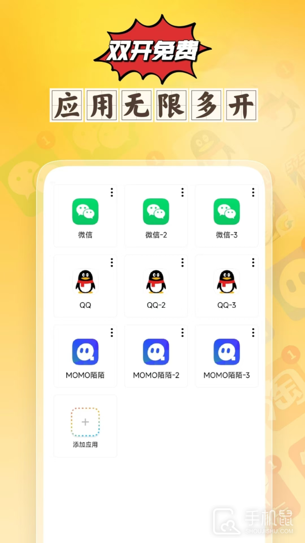 •点击添加,将想要添加的手机应用如微信、QQ、陌陌、心遇、Facebook、WhatsApp、部落冲突、王者荣耀、皇室战争、梦幻西游等添加到双开助手的主界面,点击已添加的APP直接登录第二个账户即可,也可以多次添加同一个应用,登录多个账户同时在线。