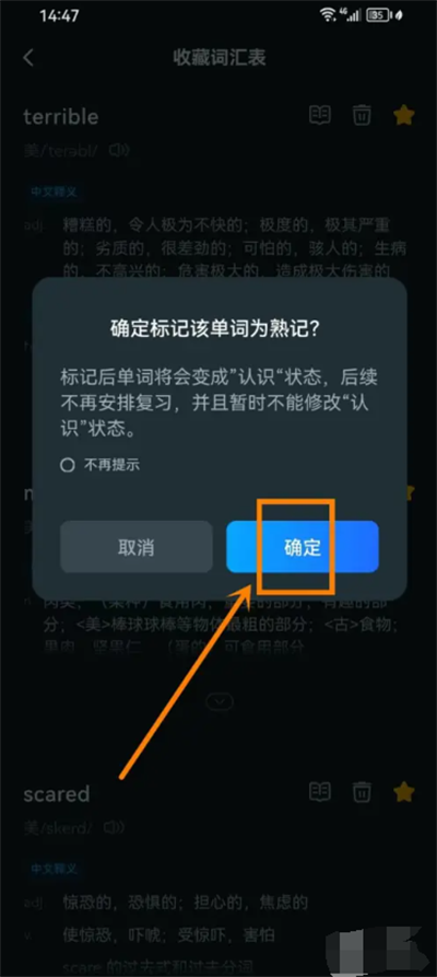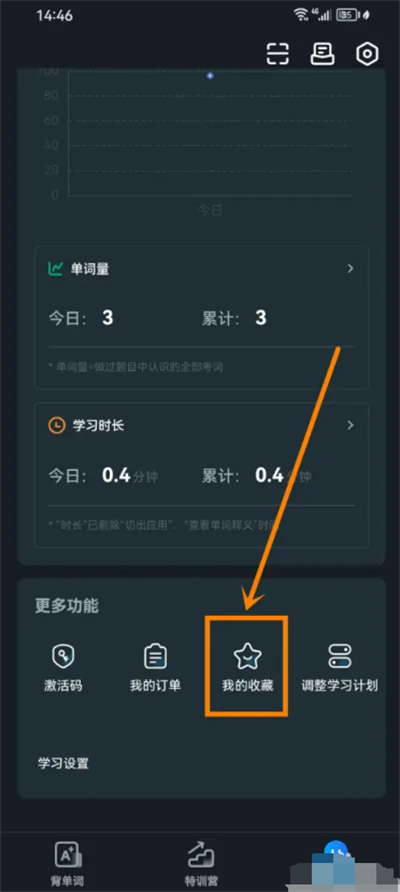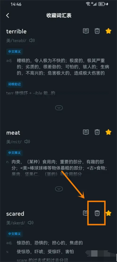 2.来到我的收藏中,选择你要删除的单词,并点击右上角的删除按钮。