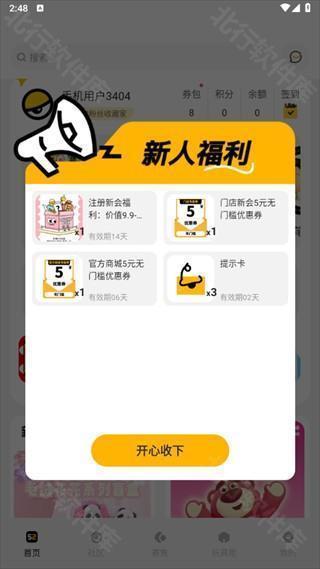 1、下载并安装蛋趣,完成后打开软件,新用户登录即可领取新会员福利礼包