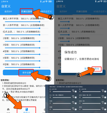3、调整适合自己的陀螺仪灵敏度后,点击保存设置,设置成功后点击启动即可。