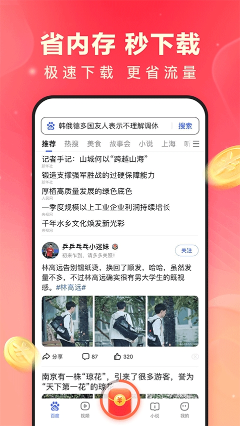 百度极速版是一款由百度在线网络技术(北京)有限公司开发的轻量级应用,旨在为用户提供流畅、不卡顿的搜索体验。app不仅体积小巧,占用内存少,适合各种容量的手机使用,还新增了扫一扫、游戏、插件中心等实用功能,使体验更加全面。