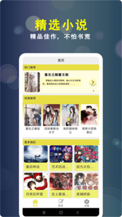 1、智能推荐:本款软件中的界面首页会为用户自动推荐经典和热门类型的小说,还可以显示评分,让用户了解更多作品。