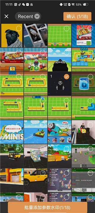 3、在水印板块中随意挑选一张,点进去,选择想要添加水印的照片,最多可以选择18张;