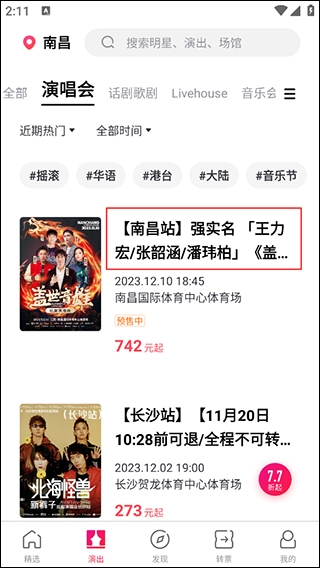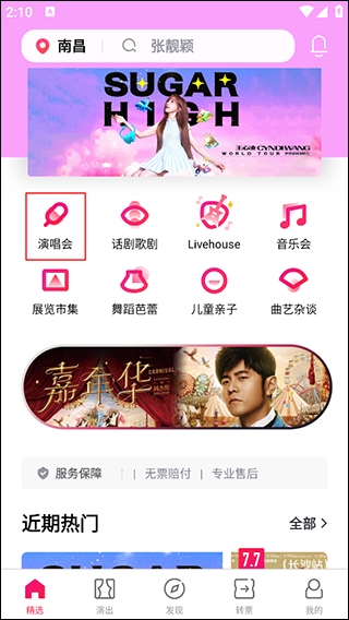 1、打开摩天轮票务app,进入到app精选首页,点击页面上方的“演唱会”选项;