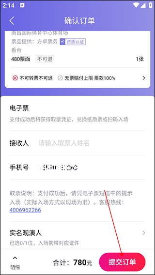 5、来到确认订单页面,填写取票人信息,以及添加观演人后点击页面右下角的“提交订单”按钮去支付即可。