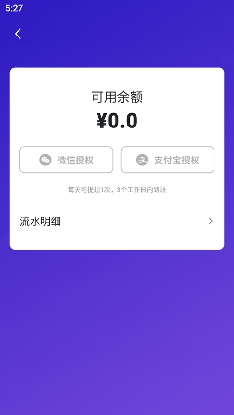 5、使用微信或者支付宝授权即可提现,每天可以提现一次,三个工作日内到账。