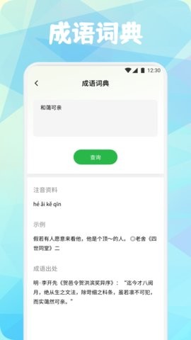 用户可以利用成语词典对各种成语的解释、例句等详情信息进行查询学习。