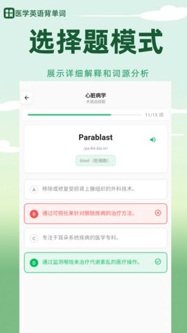 帮助用户高效学习相关的医学词汇,从而可以提高用户的背词效率,有效提升。