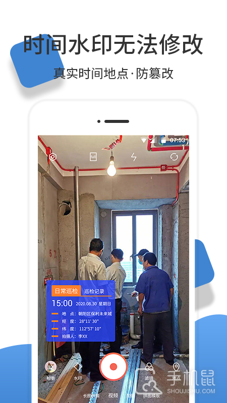 实时记录时间、地点、经纬度、海拔、施工事项,项目内容等水印。