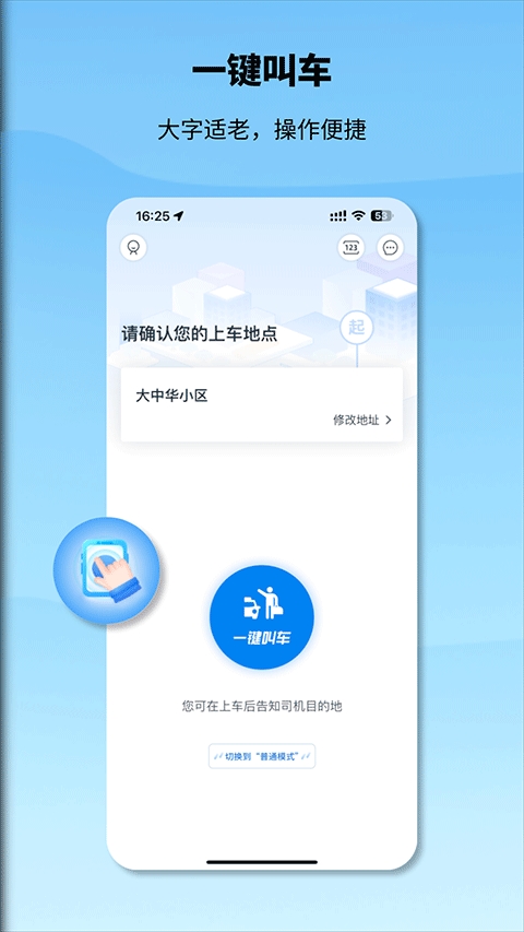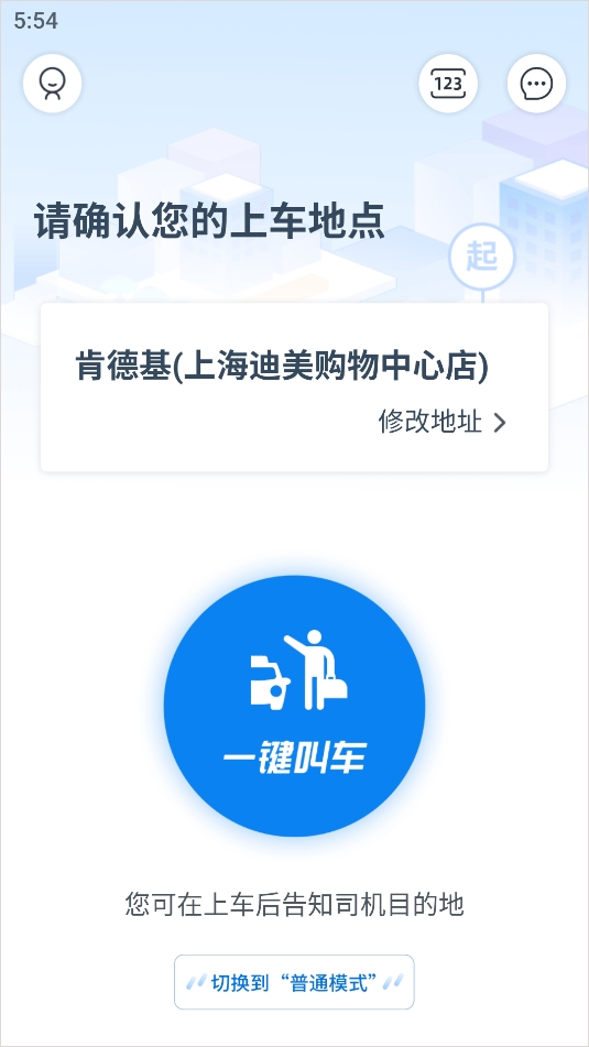 1、打开申程出行app,来到用户首页,点击下方的“一键叫车”按钮,再选择您的上车地点,就可以确认叫车了;