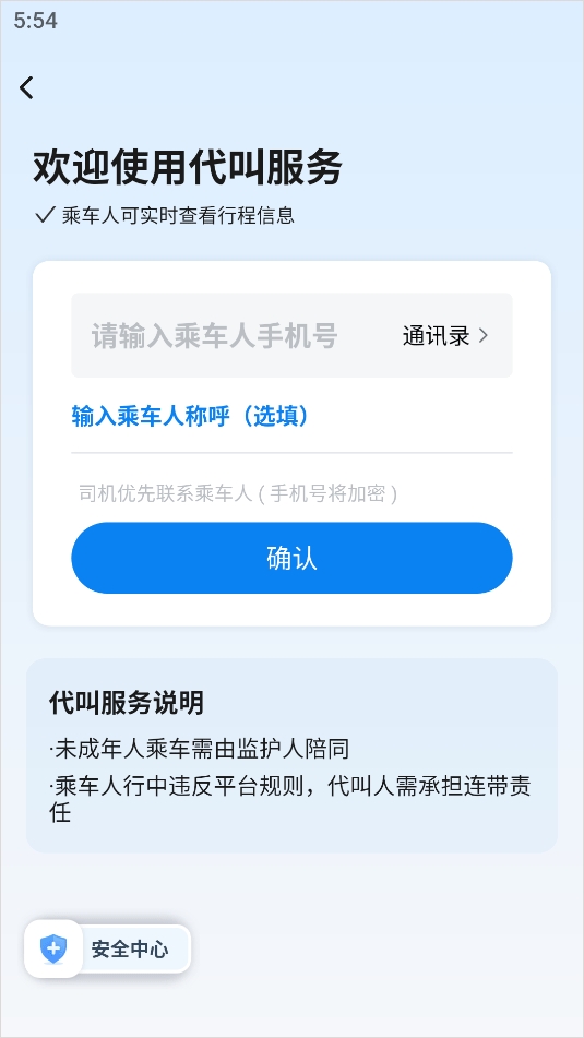3、点击“代人叫车”选项还可以使用代叫服务,输入乘车人手机号以及姓名,再选择上车点即可代人叫车;