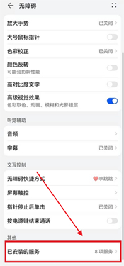 2、在点击OK的功能之后,会进入到下一个页面无障碍,在这里找到最下面的已安装的服务,直接点击;