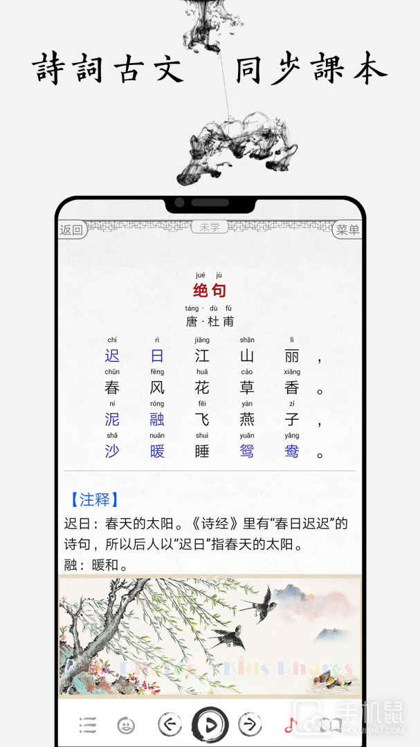 3、【软件界面】国学,诗词,古诗,文言文,成语图文并茂,水墨风插画匹配正文大意,方便学习与理解。