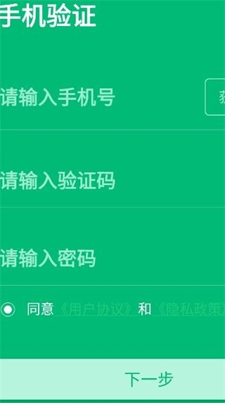 3、进行手机验证,输入手机号,验证码和密码,点击下一步