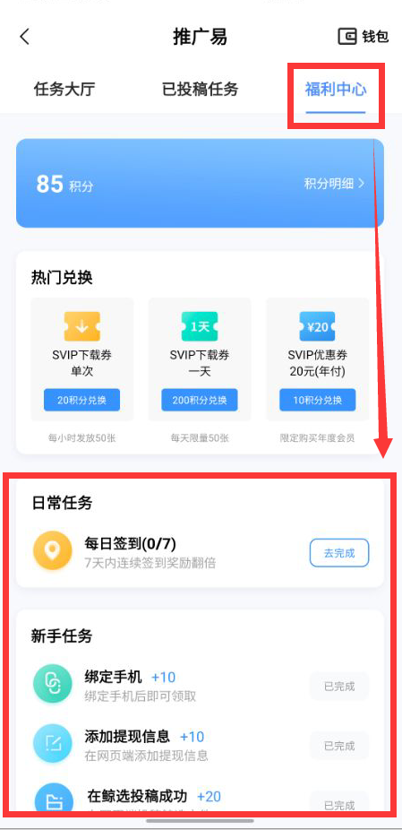 方法二:在推广易界面中,找到“福利中心”,在日常任务和新手任务里选择您感兴趣的任务参与,即可获取积分兑换下载券。