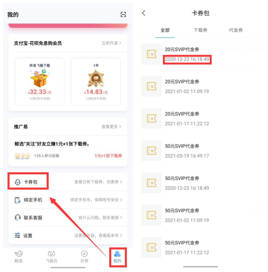 点击“我的”,找到并点击“ 卡券包 ”,即可查看SVIP下载券。