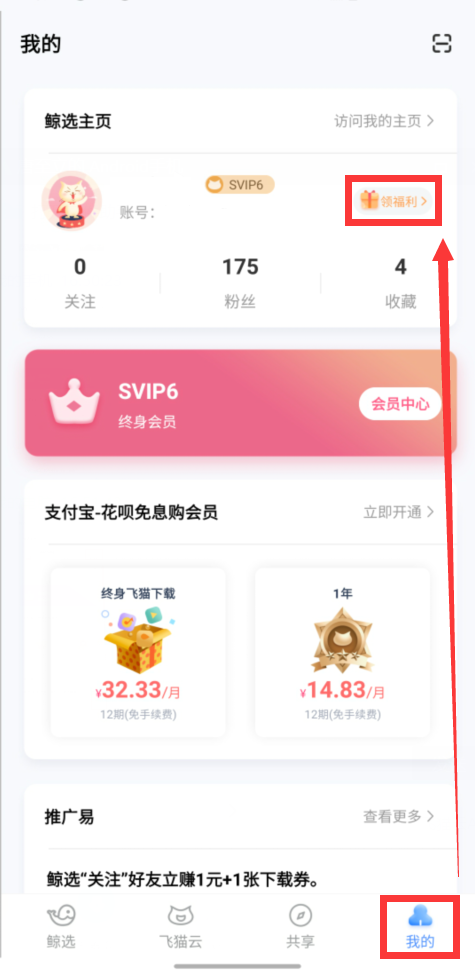首先按照下图所示,在本站下载的飞猫盘app上找到“我的”中的“领福利”。