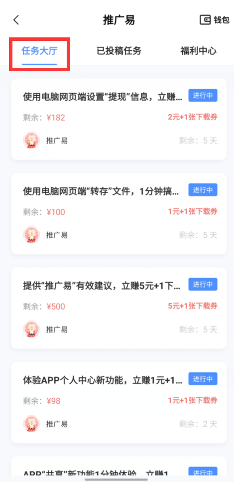 方法一:进入推广易界面,找到“任务大厅”,选择你感兴趣的任务并参与,即可获取收益和下载券。