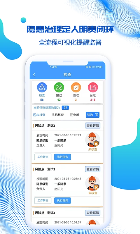 2、一键快速核查隐患信息,了解隐患的情况,便于管理,隐患核查更方便,知道隐患的问题,处理更简单;