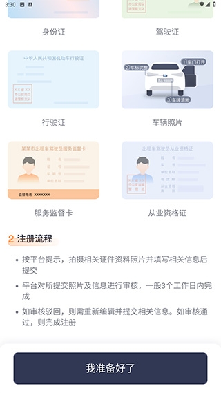 4、然后查看需要准备的资料点击我准备好,资料包括身份证、驾驶证、行驶证、车辆照片等