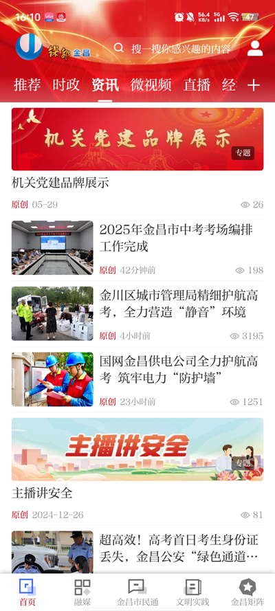 金昌本地新闻:及时发布金昌市的重大新闻、时政要闻、会议精神等,让市民第一时间了解家乡动态。