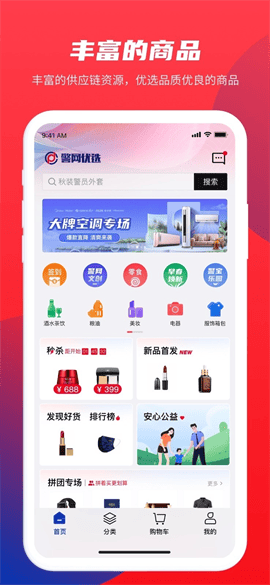 警网优选是中国警察网旗下的惠警商城,集纳品质优良、设计创新的党建文化产品、警营文创产品、工会福利产品等,经营品类丰富,包括电器、美妆、服饰、母婴、生鲜、零食、米面粮油、酒水茶饮、公安专业书籍等多个领域,还承诺99%的商品价格低于主流电商平台,并提供每日签到领现金、限时1元秒杀、幸运转盘大抽奖等优惠活动!
