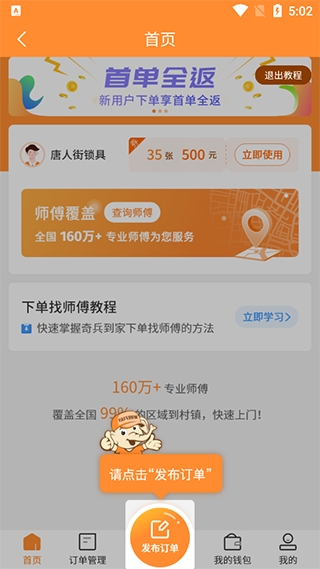 1、登录奇兵到家app,点击【发布订单】;
