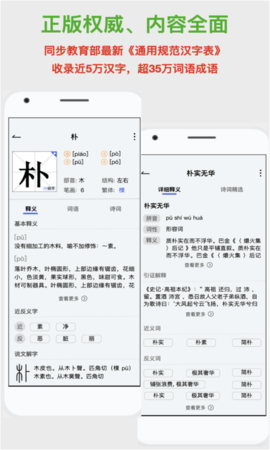 权威中文:收录中文字词多达四十多万条,全面同步《新华字典》教育部《通用规范汉字表》,囊括了K12学习常见字、词语、成语等。