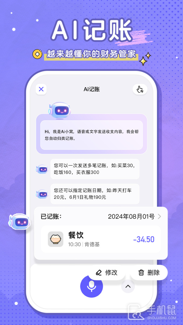 4、轻松记账点击首页记账按钮选择类型输入金额即可完成一次记账