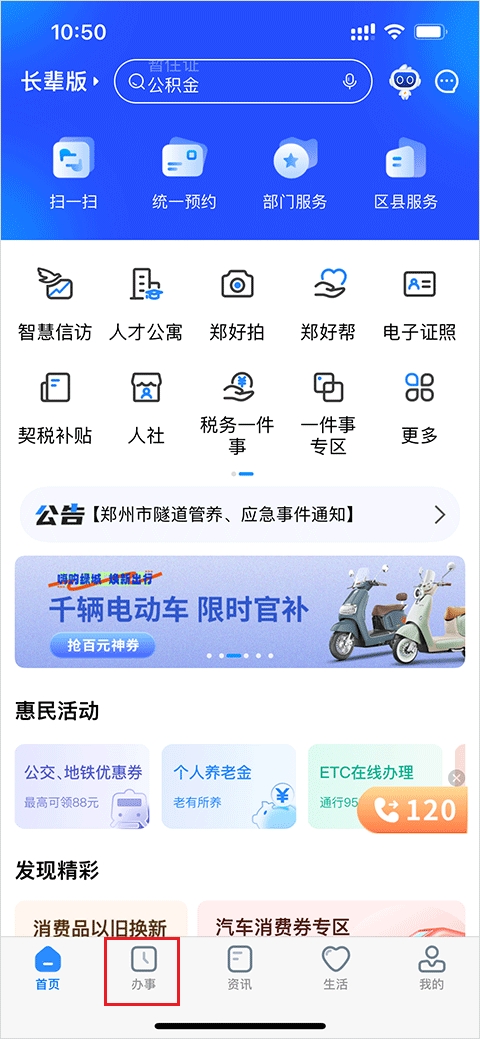 1、打开郑好办app,来到用户界面,点击下方的“办事”选项;