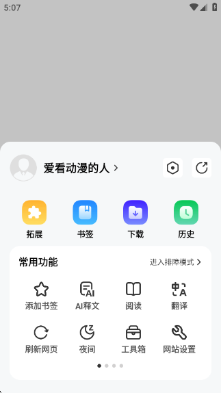 3.点击下方菜单栏图标,还为大家提供了无痕浏览、网页搜索、语音助手等功能。