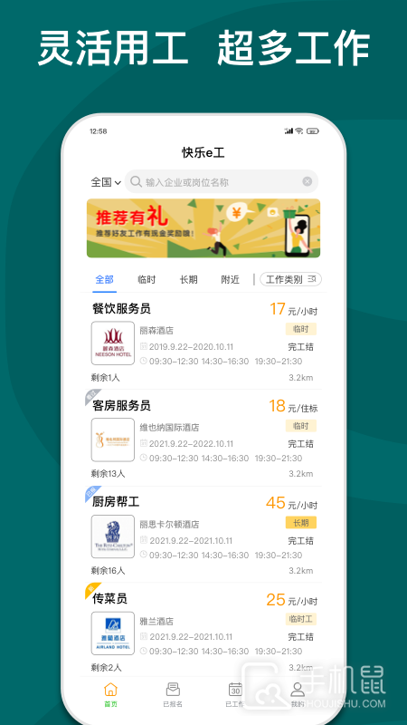 6、快乐e工平台在某种程度上还为酒店节省了不少费用。以前在用工高峰,比如,年底年会高峰季,社会上的一些劳务公司就会联合起来抬高价格,要价比平时高出两三倍,让酒店人事主管完全丧失议价权,造成酒店人工成本上浮