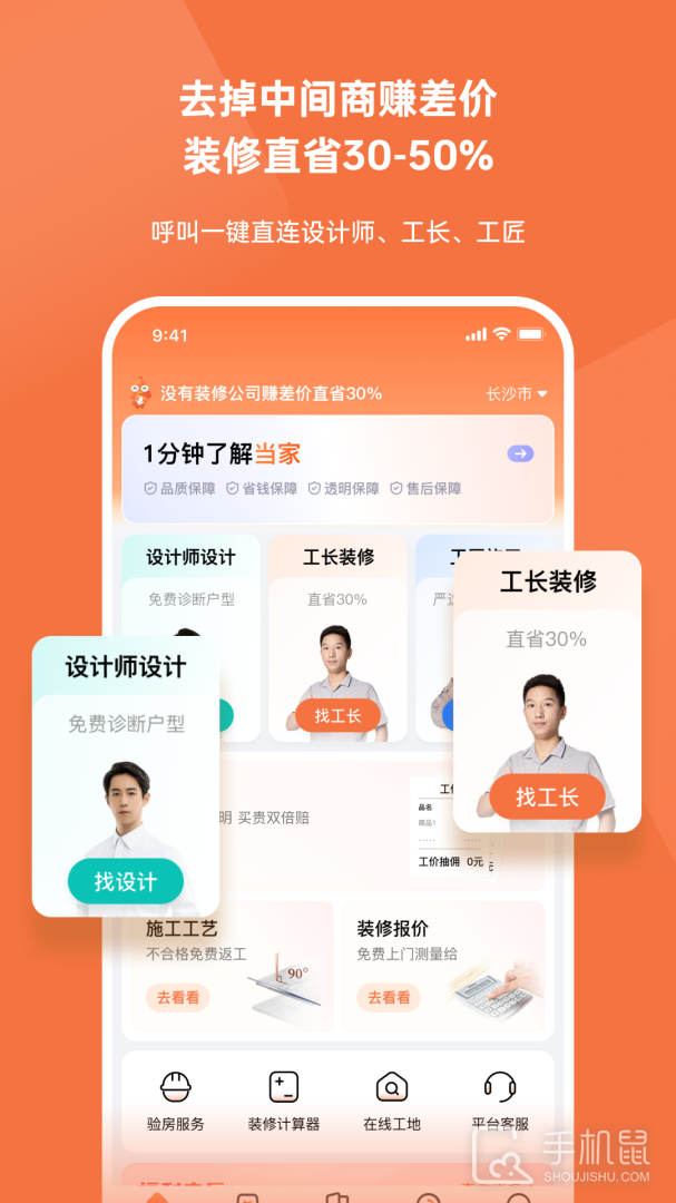 您只需轻触按钮“立即装修”,在app上选择设计师由您提供房屋数据,设计师出图,您审核确定设计方案即可施工。