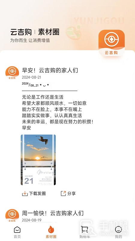 2、分享赚钱:云吉购支持用户在线分享商品素材免费赚取佣金,增加个人的收益