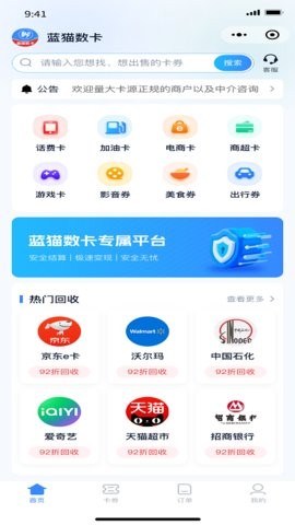 蓝猫数卡安卓版这是一款数卡回收服务平台,里面能够回收不同类型的数卡,为不同用户提供回收服务,回收后十二小时内发送回收金额,目前支持京东e卡,天猫超市卡,微信立减金,中石化卡和中石油卡等等,回收价格实惠,让更多的用户们满意,赶紧来试试吧。