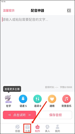 1、打开配音神器,在首页中找到【工具】,点击打开。