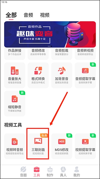 2、在【工具】页面找到【视频工具】里的【三联封面】,点击打开。