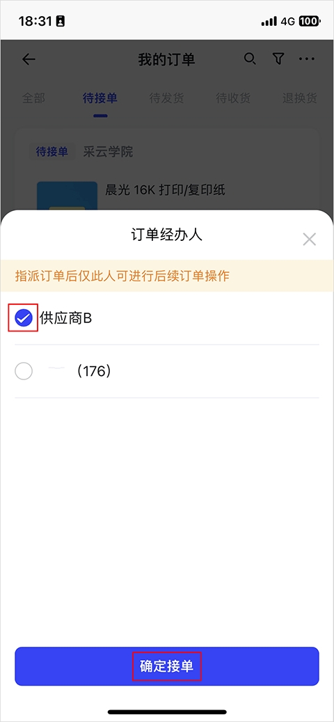 采购人发起订单后,供应商根据实际情况接单或拒绝接单。