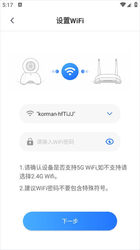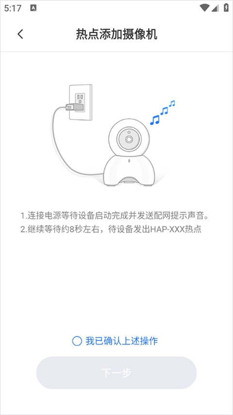 4、在热点添加摄像机的页面上按照提示,将摄像头连接到电源和路由器,然后点击“打勾”操作步骤,再点击“下一步”;