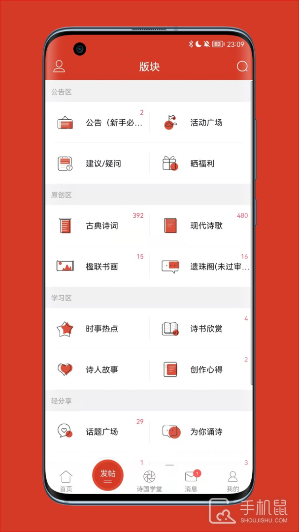 3、中国诗歌网app除了拥有强大的原创写作平台,网友还可以通过诗歌社区以诗会友,发起分组分话题讨论