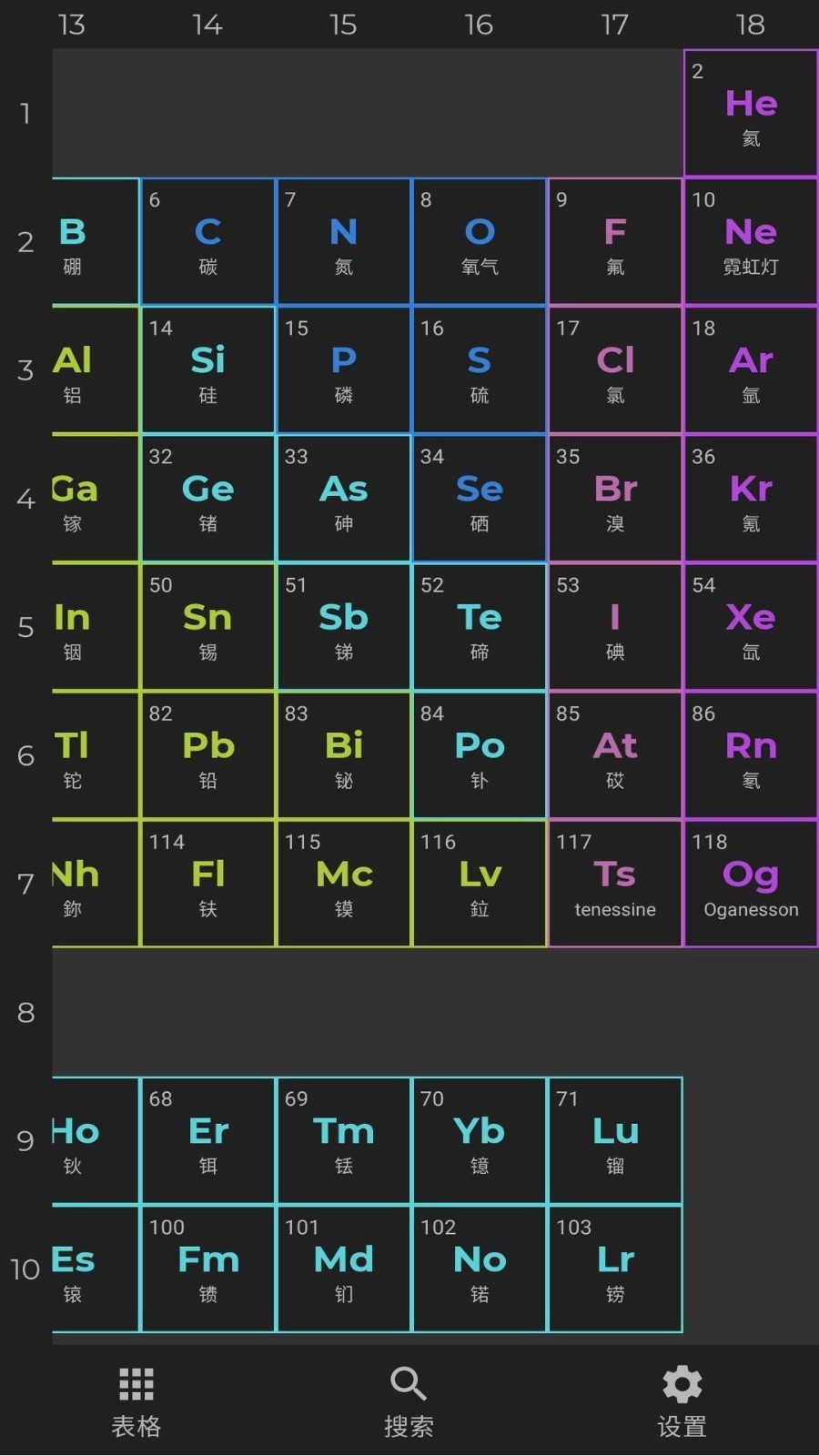 4、完整周期表:软件主页以炫酷简约的界面展示了完整的元素周期表,