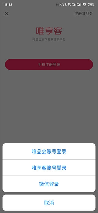 1、在本站下载安装,并且运行唯享客app,然后用微信,唯享客、唯品会、登入: