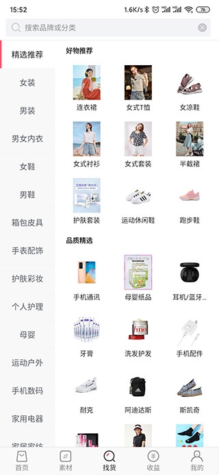 2、然后你会看到5个板块分别为首页、素材,找货、收收益、我的,点开首页这里有大量的商品供用户选择及分享: