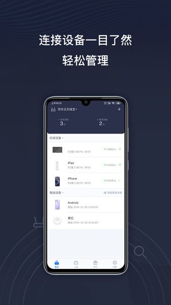 京东云无线宝是京东云推出的一款智能路由器管理软件,持常规的路由器管理功能,如修改Wi-Fi名称、密码、端口转发等,用户可以通过它轻松管理家中的网络!支持多种频段,包括2.4G、5.2G和5.8G,提供高速的网络体验,并具备Mesh组网功能,适合大户型使用,以实现全屋覆盖!