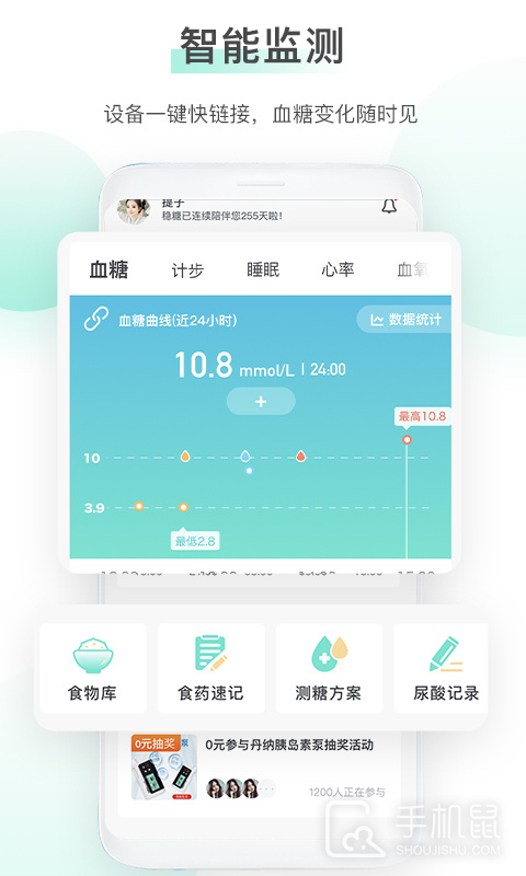 1、监测:可随时记录血糖数据,帮助糖友随时看到自身糖尿病数据,为自我血糖管理提供数据帮助