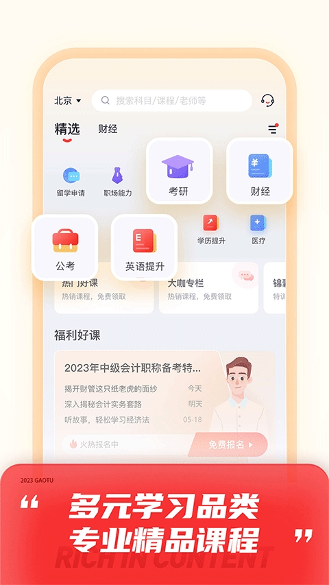 高途是在线直播授课、个性化学习辅导于一体的教育应用,包含财经、考研、公职、家庭教育、出国留学、实用英语等多个教学品类,采用“主讲授课+双师辅导”的教学模式,由一线主讲老师在线直播授课,课程内容精细打磨,同时配有专业二讲老师及时答疑解惑,课前引导预习,课后辅导复习。