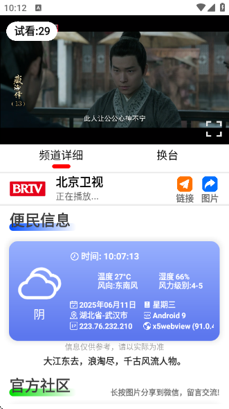 4.点击相关频道,就可以在线观看,下拉页面还能看到便民信息。