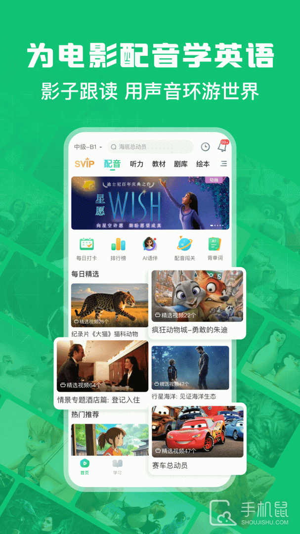 3、体系学:动漫电影专项口语训练,帮助不同语言学习阶段的用户,设计体系化、专业化的学习体验,每天20- 30 分钟,AI智能评估体系,呈现清晰学习报告,实现可视化的语言学习效果。