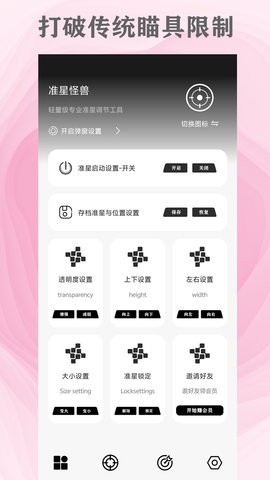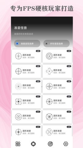 准星怪兽是轻量级专业准星调节工具,你可以切换瞄具图标,启动准星设置,包括透明度设置、上下设置、左右设置和大小设置等功能,还有准星的形状类型选择,有准星造型和环形造型多种造型选项,以及上百种准星模版可调节哦~