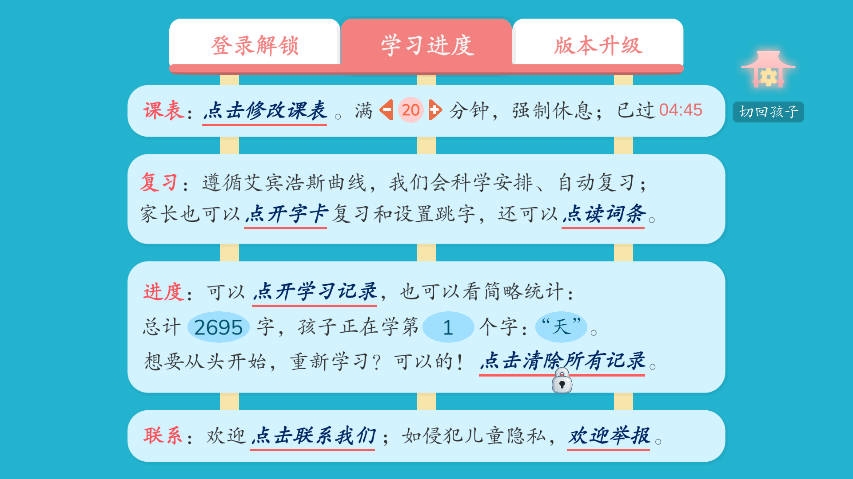 合理规划:识字课程和儿童游戏由简到难,每天10分钟,每天学习6个汉字。